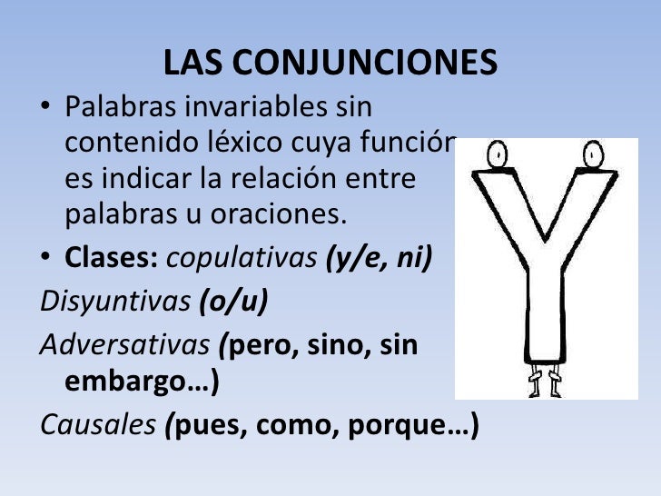 9.   9. LAS CONJUNCIONES• Palabras invariables sin contenido léxico cuya función es indicar la relación entre palabras u oraciones.• Clases: copulativas (y/e, ni)Disyuntivas (o/u)Adversativas (pero, sino, sin embargo…)Causales (pues, como, porque…)