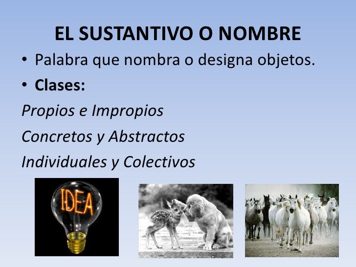 3.   3. EL SUSTANTIVO O NOMBRE• Palabra que nombra o designa objetos.• Clases: Propios e Impropios Concretos y Abstractos Individuales y Colectivos