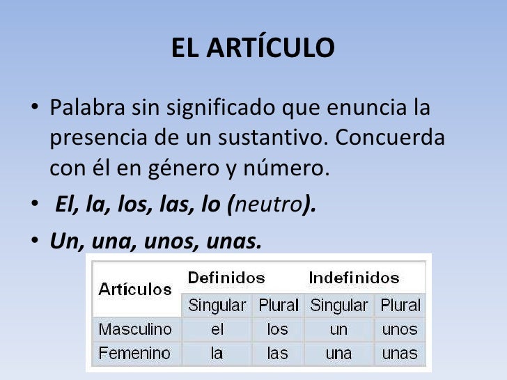 4.   4. EL ARTÍCULO• Palabra sin significado que enuncia la presencia de un sustantivo. Concuerda con él en género y número.• El, la, los, las, lo (neutro).• Un, una, unos, unas.