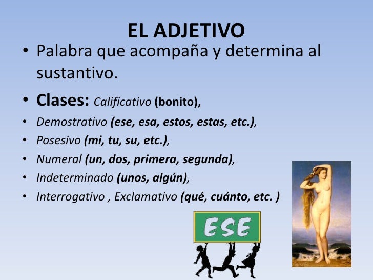 5.   5. EL ADJETIVO• Palabra que acompaña y determina al sustantivo.• Clases: Calificativo (bonito),• Demostrativo (ese, esa, estos, estas, etc.),• Posesivo (mi, tu, su, etc.),• Numeral (un, dos, primera, segunda),• Indeterminado (unos, algún),• Interrogativo , Exclamativo (qué, cuánto, etc. )