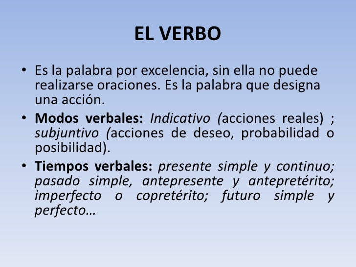 7.   7. EL VERBO• Es la palabra por excelencia, sin ella no puede realizarse oraciones. Es la palabra que designa una acción.• Modos verbales: Indicativo (acciones reales) ; subjuntivo (acciones de deseo, probabilidad o posibilidad).• Tiempos verbales: presente simple y continuo; pasado simple, antepresente y antepretérito; imperfecto o copretérito; futuro simple y perfecto…
